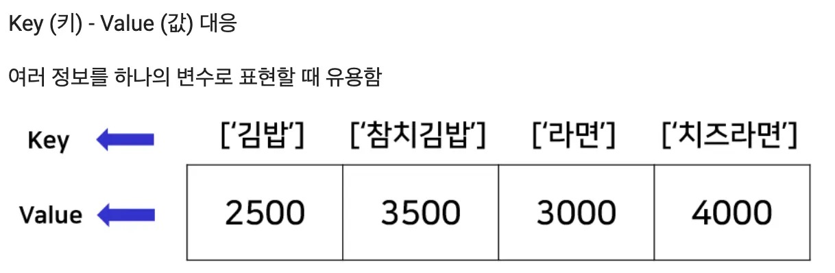중괄호: 딕셔너리 이름={key1:value1, key2:value2,...}