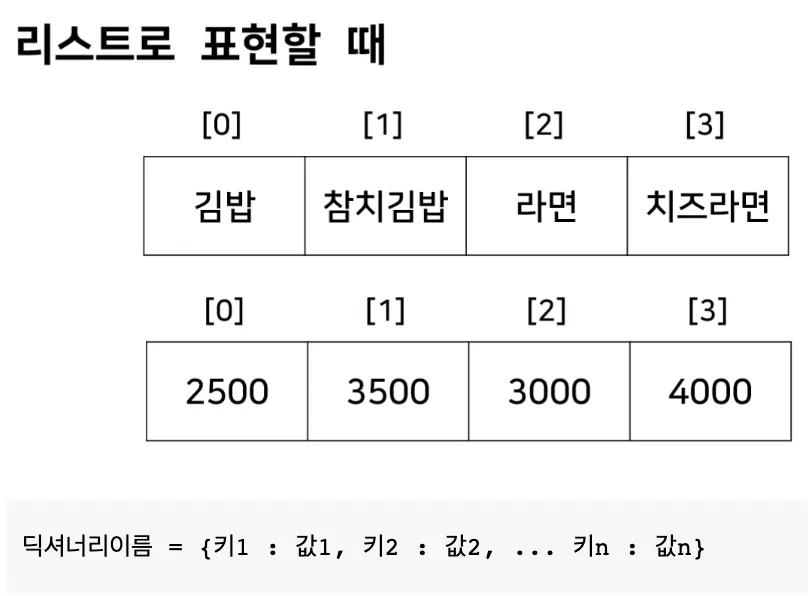 리스트는 "인덱스:값"형식으로 저장하나, 딕셔너리는 "key: value"형식으로 저장